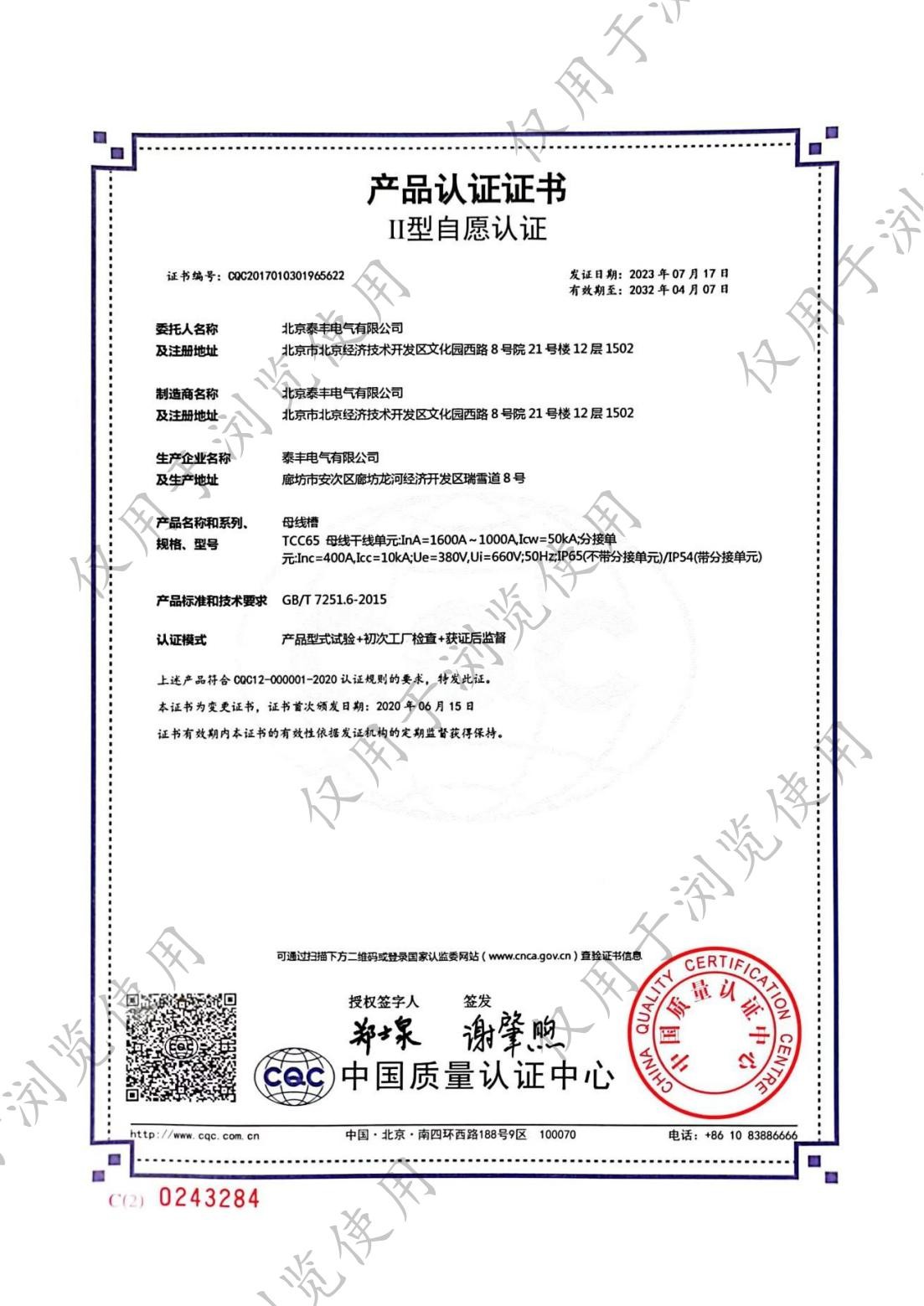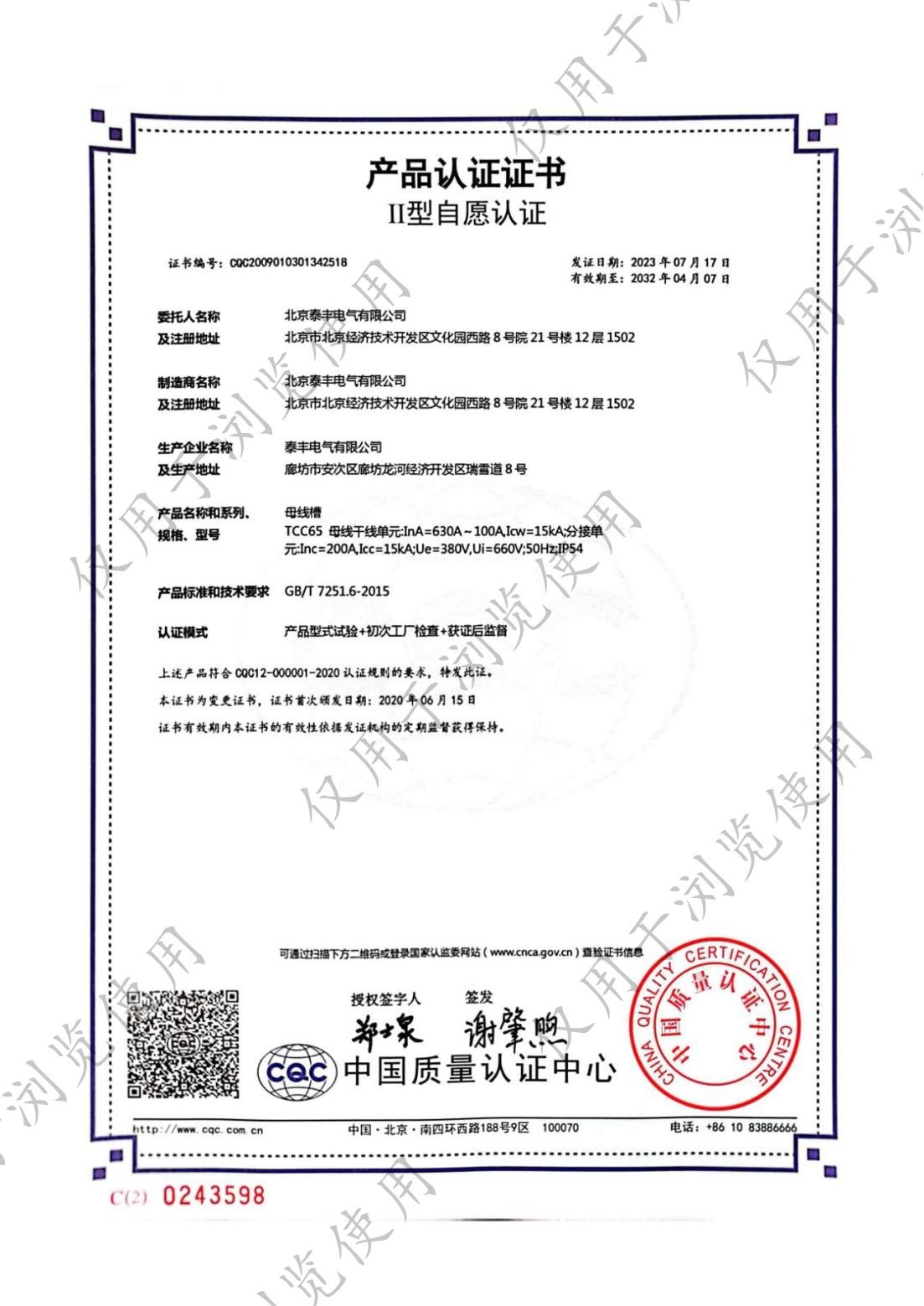 ■ 生产的母线槽系列、电缆桥架顺利地通过了IS09001标准质量体系认证、母线槽系列均通过CCC认证,母线槽电流达到6300A,2006年5月电缆桥架系列产品顺利通过了CQC自愿性产品认证。